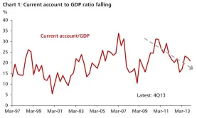 Current account surplus to GDP ratio has been falling.